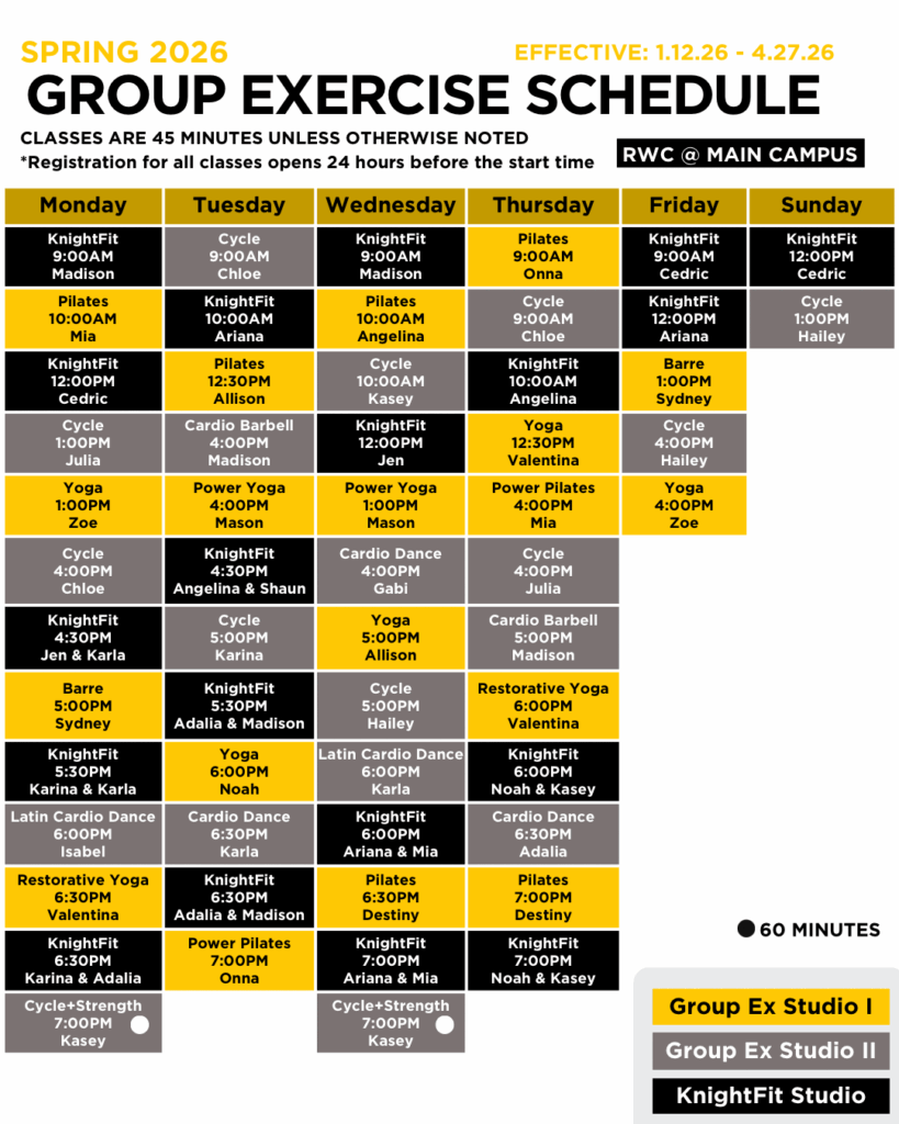 You are now registered! All classes are 30-55 minutes in length unless otherwise noted. Please bring a towel and water bottle. If you make a reservation and decide you cannot make it for your workout, please cancel your reservation to open up a spot for another Knight. Cancellations must be made at least 1 hour prior to class.